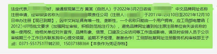 最后:告诉广大客户,普通中文域名无较大投资价值,我们一般不建议客户注册使用,且中文域名在解析时还多一步转码操作。如遇续费通知务必打我电话确认,切勿轻易汇款!切勿轻易汇款!切勿轻易汇款!重要的事情说三遍。