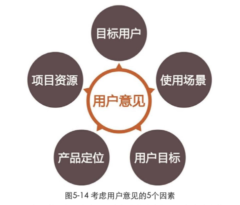 如何转化为产品需求?需求的分析与筛选"中我们是综合考虑哪些因素来分析需求的。考虑各种情况,我们最终细分出图5-14中这5个具体因素,并分别举例说明之。